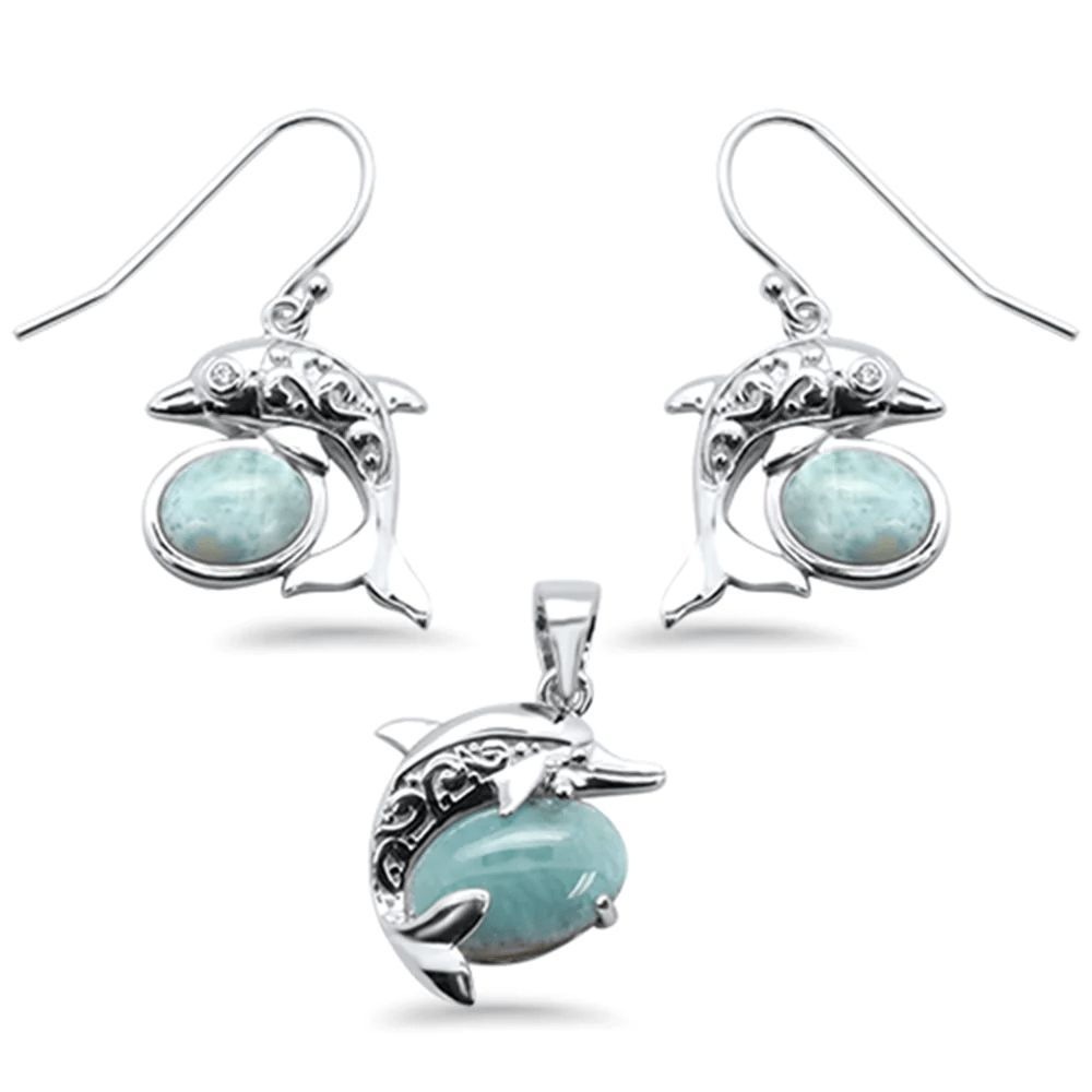 Oval Natural Larimar Dolphin .925 Sterling Silver Pendant & Earring Set