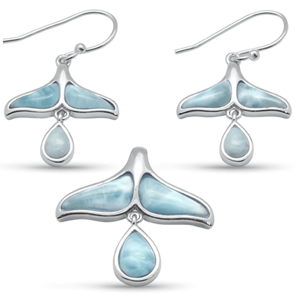 Whale Tail & Pear Shaped Natural Larimar .925 Sterling Silver Earring & Pendant Set